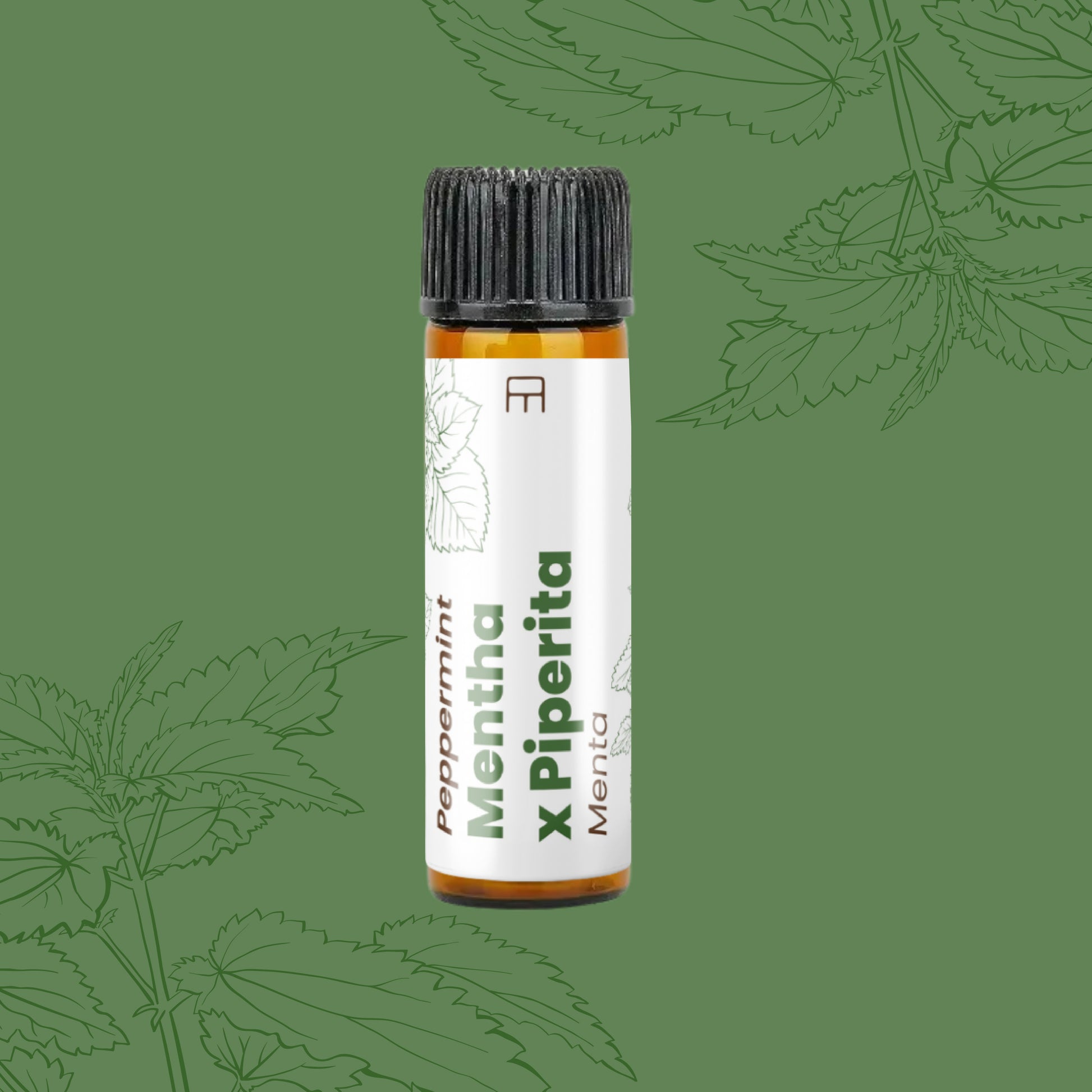 Glass bottle with 5.5 ml of 100% pure peppermint essential oil.